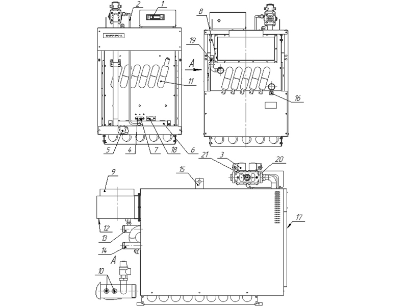 12. Место отбора проб уходящих газов 13. Патрубки отопления (подача) 14. Патрубки отопления (обратка) 15. Транспортировочные проушины 16. Сливная пробка 17. Дверка 18. Глазок для контроля пламени 19. Предохранительный клапан 20. Штуцер для замера давления газа 21. Регулятор давления газа . |